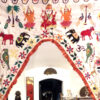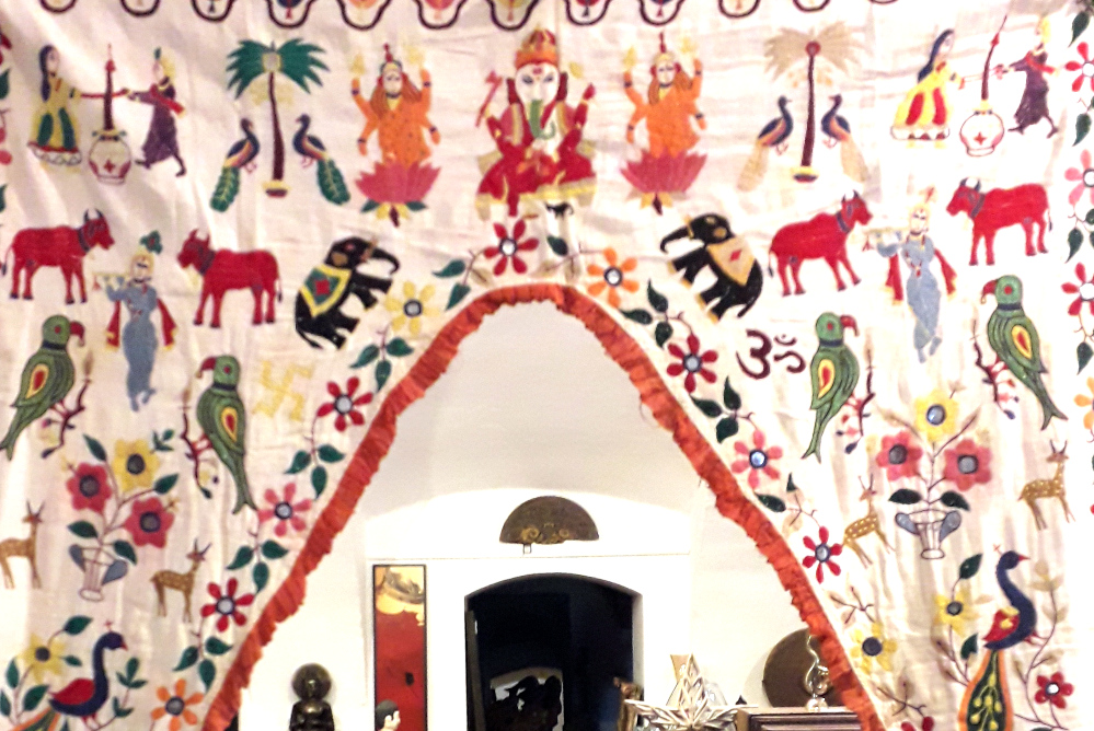 Mit Ganesha, Nandi, Pferd, Pfau, Palmen und Blumen fröhlich bunt bestickter Stoff aus Goa, ideal als Wandschmuck oder als Türumrandung!