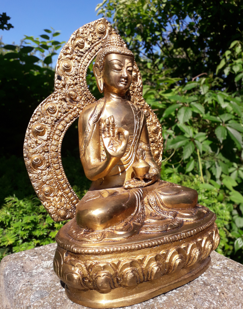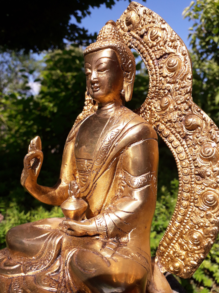 Dieser Buddha steht für die vollkommene Weisheit, die Vollendung des buddhistischen Weges und der Vernichtung des Neids mit all seinem Gift, massives Messing, Einzelstück aus Indien!